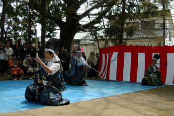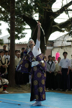 | 続いて上村明世氏による矢渡し、岩崎氏・小嶋氏・田中による花形体配の奉射を行いました。 |