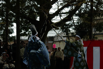 | 安土を清めるため、白羽の矢三本を、白扇の天人地(上,左下,右下)の方向に散らして射込みます。 | ![]() |