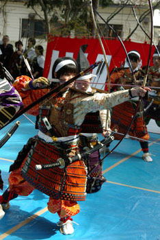 | これも恒例となった、鎧武者による演武です。 四つ矢による競射の結果、高校生が見事優勝し、堂々と納射を努めました。 来年も4月の第二日曜、同所での開催を予定しています。 |