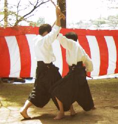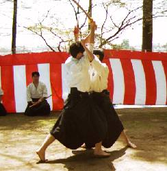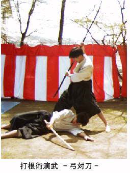 摂津系同門会ではこの打根術の継承に取り組んでおり、毎年4月の「川西市源氏まつり奉納射会」や射会において打根術の演武を披露しています。下の写真では、右の演武者が手に持っているのが打根(このときは打根を模した木の棒)です。